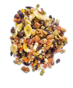 Un assortiment naturel et généreux de fruits secs, de légumes, de noix diverses, de graines et de céréales pour perroquets, aras et autres grands oiseaux