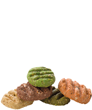 blé, farine de blé, tourteau d'extraction de soja, sons, carottes séchées (2,7%), huile de maïs, levure de bière, farine de pomme de terre, chou (0,3%), poire, épinards (0,1%)