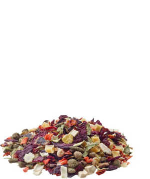 caroube concassée, granulés de pommes de terre, panais (9%), flocons de betterave rouge, carottes séchées (8,5%), flocons de pois, flocons de féveroles, foin timothy, flocons de tomates, poireau (4%), flocons de poivron rouge, pois, coques de soja, tourteau d'extraction de graines de tournesol, farine de pomme de terre, farine de soja, pois cassés, graine de lin, graines de soja toastées, luzerne, pulpe de betterave séchée, phosphate monocalcique, carbonate de calcium et de magnésium, chlorure de sodium, huile de soja brute, yucca des Mohave (72 mg/kg), fructo-oligosaccharides, mannan-oligosaccharides, algues séchées, stévia, propylèneglycol, sucre