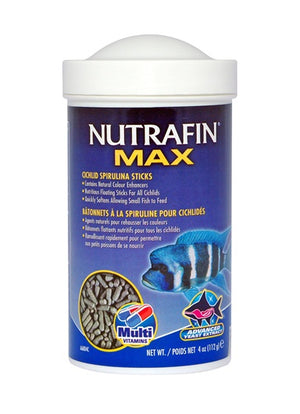 Nutrafin Max Cichlid Spirulina Meal Sticks is a nutritious, highly palatable fish food that provides the ultimate in ornamental fish nutrition. Naturally coloured by their ingredients, the dark green floating sticks contain 10% spirulina and a natural binder that supports digestive conditions.