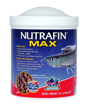 Nutrafin Max Predator Sticks is a nutritious highly palatable formula naturally coloured by its ingedients in a high value format containing 80 g (2.82 oz) of protein rich floating food sticks, ideal for most large species of tropical fish.